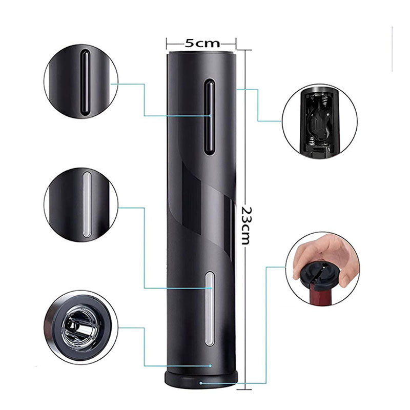 07503049816166 Hecha de acero, superficie negra mate que hace que este sacacorchos eléctrico se convierta en una herramienta elegante y refinada para su cena, garantiza un uso seguro. Potente y silencioso: Gracias al engranaje de alta precisión, el destapador de vino solo tarda unos segundos en sacar un corcho automáticamente. Incluso menos de 60 decibelios de ruido de trabajo, lo completan en un abrir y cerrar de ojos. Práctico: La ventana transparente única visualiza todo el proceso de extracción del corcho. El cortador de papel de aluminio incluido puede quitar fácilmente el sellado, lo cual es muy conveniente. Ligero, portáti. Puede quitar el corcho en 7 segundos sin romper el corcho presionando el botón Abajo y Arriba sin interrupción de ruido. Regalo perfecto: Un regalo perfecto para cualquier ocasión, como una fiesta en casa, una boda, un restaurante, un bar o una fiesta al aire libre. El diseño delicado de este abridor de vino eléctrico lo convierte en un buen regalo para los amantes del vino. Material: Acero Inoxidable. Medidas: 23CM X 4.8CM Funciona con 4 baterías AA (no incluidas)