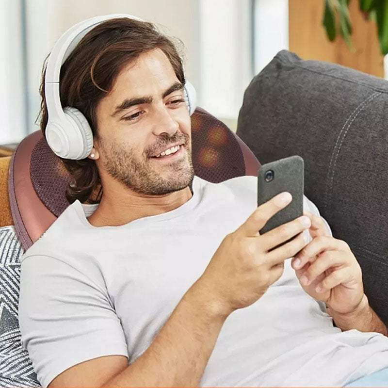 07503033584194 Almohada de masaje para el cuello y la espalda del auto y el hogar con calor. 4 nodos de masaje profundo ayudan a aliviar y relajar la tensión muscular. Función de calentamiento que alivia los músculos adoloridos Diseño ergonómico, perfecto para usar en la parte inferior y superior de la espalda, el cuello, el abdomen, la pantorrilla y las zonas de los muslos. cambiará la dirección de amasado automáticamente cada 1 minuto. ajustable puede asegurar la almohada a la silla de su hogar o automóvil. Puede ser usado para vehículo y hogar. Incluye un cargador de casa regular y un adaptador de auto gratis. Equipado con dispositivo de protección contra sobrecalentamiento y apagado automático para garantizar la seguridad.